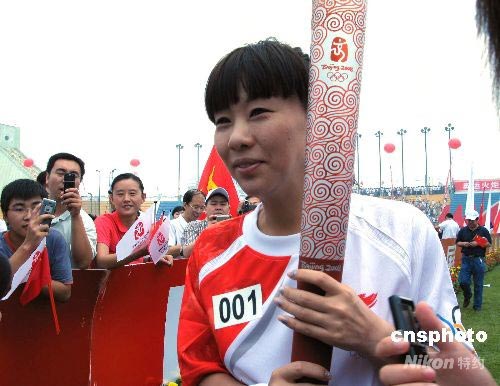 圖:奧運冠軍錢紅唐山傳遞奧運火炬首棒