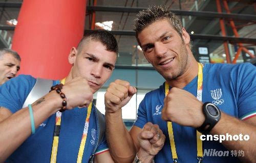 8月1日,即將參加北京奧運會的意大利拳擊手飛抵北京首都國際機場。圖為意大利拳擊手valentino oomenico(左)與隊友在一起。 中新社發 陳文 攝