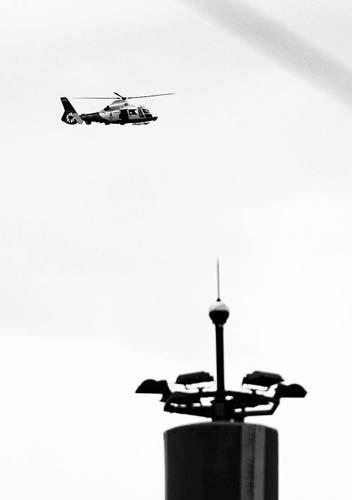 8月1日,執行安保任務的國產警用直升機盤旋在北京奧運場館上空。 喻志勇攝