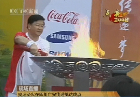 8月3日上午,二00八北京奧運會火炬在鄧小平的家鄉——廣安傳遞,廣安也是奧運火炬在四川傳遞的首站。此次傳遞全程七點三公里,共有一百八十九名火炬手參與傳遞,其中年齡最大的八十五歲,最小的十五歲。9時15分火炬到達終點廣安會展中心,末棒火炬手王建軍點燃圣火盆。