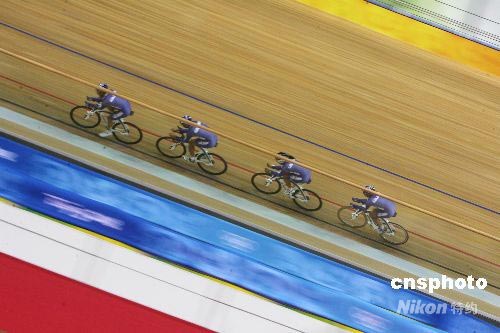 8月4日,哥倫比亞隊隊員在北京老山自行車館進行訓練,備戰即將揭幕的北京奧運會。 中新社發 武仲林 攝