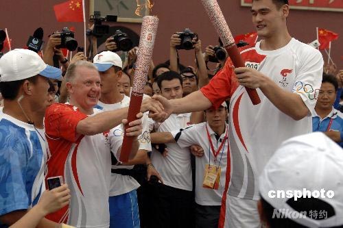 圖:維爾布魯根與姚明交接奧運火炬