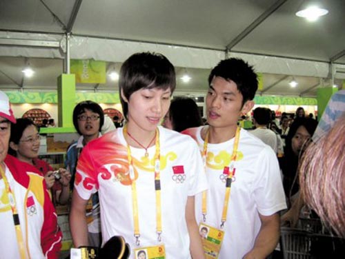 出門,兩人立刻就被“可口可樂交換紀念章”的店給吸引進去了,結果兩人一人弄了一件免費的環保T恤。一路上,圍觀拍照的人很多,林丹和謝杏芳很大方,不管是合影或者簽名,都來者不拒,而且絕對掛上微笑。看著羽毛球男女隊的領軍人物,在大賽前能有這樣的心情和心態,真的很高興。對于記者的提問,林丹也不拒絕,但他說:“我現在不想說比賽的事兒,不過我的狀態非常好。”住進了奧運村,林丹說:“這里環境非常好,比雅典時候好。”而謝杏芳微微抱怨,“就是床小了點兒。”