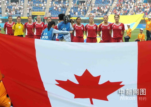 8月6日下午,奧運女足在天津“水滴”體育場拉開戰幕,首場比賽阿根廷女足迎戰加拿大。圖為加拿大女足出場儀式。 中新社發 陳文 攝
