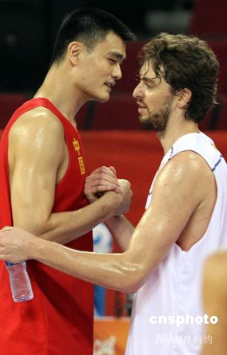 8月7日,世界冠軍西班牙男籃在北京奧運(yùn)會(huì)籃球比賽館--五棵松籃球進(jìn)行賽前的最后一場(chǎng)熱身訓(xùn)練,效力于NBA洛杉磯湖人隊(duì)的超級(jí)球星保羅·加索爾(左)結(jié)束訓(xùn)練后與前來(lái)訓(xùn)練的中國(guó)隊(duì)超級(jí)中鋒姚明親切交談。中國(guó)與西班牙隊(duì)是同組死敵,按照實(shí)力分析中國(guó)隊(duì)擊敗世界冠軍西班牙隊(duì)的希望渺茫。 中新社發(fā) 任晨鳴
