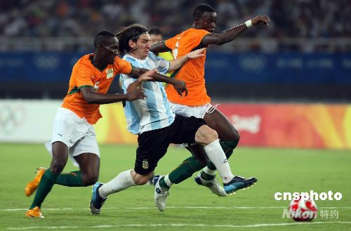 8月7日,北京奧運會上海足球分賽場男足預(yù)賽,在衛(wèi)冕冠軍阿根廷對陣科特迪瓦的比賽中, 阿根廷以2:1取勝迎來開門紅,球星梅西(MESSI Lionel)為阿根廷攻入本屆奧足賽首粒進(jìn)球。圖為梅西帶球從人縫中突破。 中新社發(fā) 湯彥俊 攝