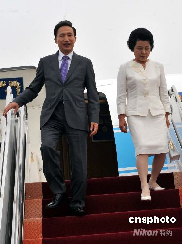 韓國總統(tǒng)李明博8月8日上午9 時許抵達北京,將出席北京奧運會開幕式及相關活動。 中新社發(fā) 宋吉河 攝