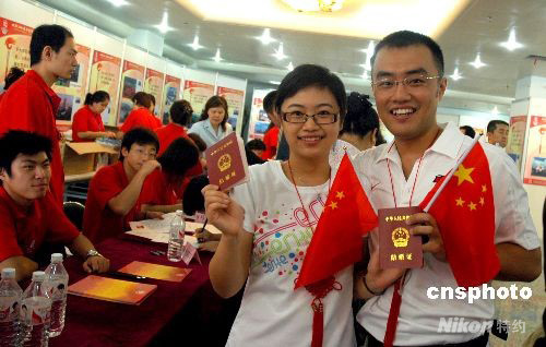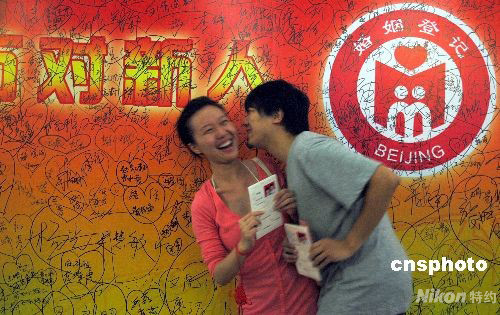 北京市西城區(qū)結(jié)婚登記處迎來了一個(gè)結(jié)婚高峰日,千余新人前來領(lǐng)取結(jié)婚證書。圖為一對(duì)新人領(lǐng)到結(jié)婚證后高興合影共慶奧運(yùn)。中新社發(fā) 張雙雙 攝