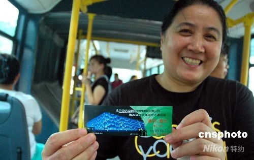 8月8日,北京奧運會開幕日,北京公交集團公司在所屬線路車上發(fā)售奧運會開幕紀念公交車票。據(jù)了解,奧運公交紀念車票分四種票樣,在不同線路車上發(fā)售,因數(shù)量有限,紀念票售完后仍出售現(xiàn)行普通票。圖為乘客高興地展示買到的奧運紀念車票。中新社發(fā) 張雙雙 攝