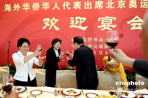 8月8日,中國國務院僑務辦公室在北京釣魚臺國賓館舉行宴會,歡迎出席北京奧運開幕式的近200位華人華僑代表。中新社發(fā) 廖攀 攝
