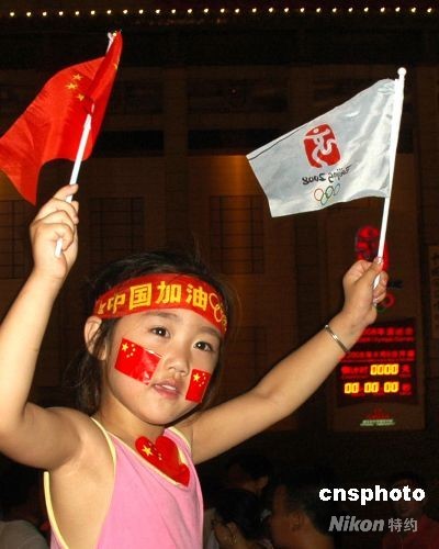8月8日晚8時,北京天安門廣場東側奧運倒計時牌歸零。在天安門廣場為北京奧運狂歡的一位小女孩拿著中國國旗為北京奧運加油。中新社發 張雙雙 攝