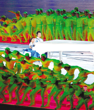 演出下篇開始,只見郎朗坐在一片藍色的海洋中,身邊坐著一個天真稚氣的小女孩兒,圍繞在他周圍的是無數穿著高科技發光服的“綠”人,郎朗面帶微笑,一臉輕松和愉悅,音符從十指間滑出,周圍的場景隨之不斷發生著奇妙變化,藍色的海洋開始呈現出中國現代化建設成就,青藏鐵路也出現在郎朗的腳下。而“綠”人身上的光也隨之變化為銀色,變換出和平鴿、銀河等造型,最后濃縮為一座微型的鳥巢,郎朗在“巢中巢”歡快地彈奏,一個小女孩飛進巢中巢,乘著風箏飛到他面前,充滿詩意。整個節目長達8分鐘,成為本屆開幕式上分量最重的個人演出。在演出結束的第一時間,通過萬寶龍公司的幫助,本報對郎朗進行了專訪。
