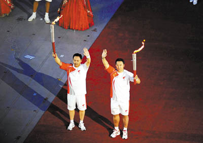 “鳥巢”內的傳遞只有8名火炬手,兩屆奧運會舉重冠軍、浙江籍運動員占旭剛幸運地成為第4棒火炬手。