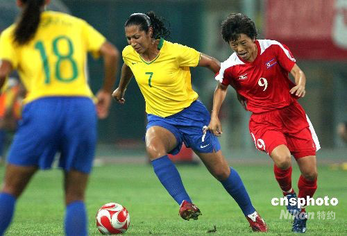 8月9日,北京奧運會沈陽分賽場舉行女足預賽,巴西隊最終以2:1勝朝鮮隊。巴西球星瑪塔打入第二粒進球。 中新社發 張宇 攝