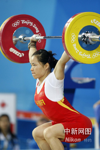 8月11日,北京奧運會開賽以來的第三天,女子舉重58公斤級的決賽在北京航空航天大學體育館拉開戰幕。雅典奧運會冠軍中國選手陳艷青獲得北京奧運會舉重女子58公斤級金牌,成功衛冕,為中國代表團贏得第八枚金牌。中新社記者 盛佳鵬 攝