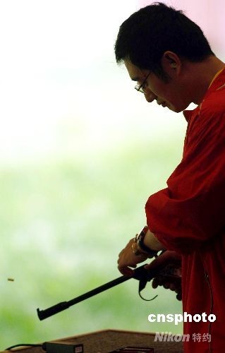 8月12日,北京奧運會男子50米手槍比賽在北京射擊館開戰,譚宗亮代表中國射擊隊出戰并殺入決賽。圖為譚宗亮在比賽中。中新社發 盛佳鵬 攝