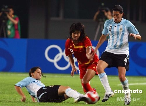 8月12日晚,奧運女足小組賽第三輪賽事展開,中國女足對陣阿根廷隊。第50分鐘,中國隊右路起球,阿根廷門將出擊失誤沒摘到球,韓端與對方防守球員碰撞中把球打進了球門。中新社發 劉新 攝