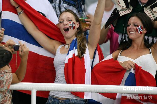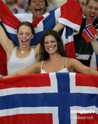 8月12日,兩位挪威美女專程趕來上海觀看奧運賽事,為挪威女足加油助威。當日,北京奧運會女足小組賽,挪威VS日本的比賽在上海體育場進行。 中新社發 湯彥俊 攝