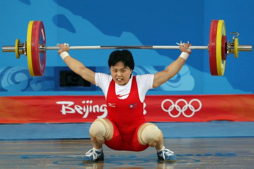 8月12日,朝鮮選手樸賢淑在北京奧運(yùn)會女子舉重63公斤級比賽中。