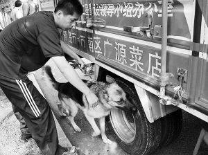 “特凱奧,上!”隨著軍犬訓導員、二級士官劉紹鵬的一聲令下,1歲半的德國牧羊犬特凱奧竄到車前,開始用敏銳的嗅覺尋找危險源。環繞一周后,它沖著車廂一角伏下了身子,不斷用低哮告訴大家“可疑目標已經找到”。經過排查,原來是車廂里面角落的一小包木炭引起了儀器反應。