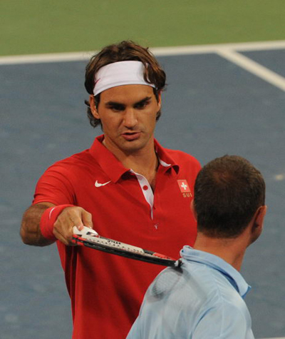 奧運賽場花許多,在網球男雙第二輪比賽前,一只螞蚱飛到了裁判的后背上,“天王”費德勒用球拍趕走了螞蚱。新華社記者邢廣利攝