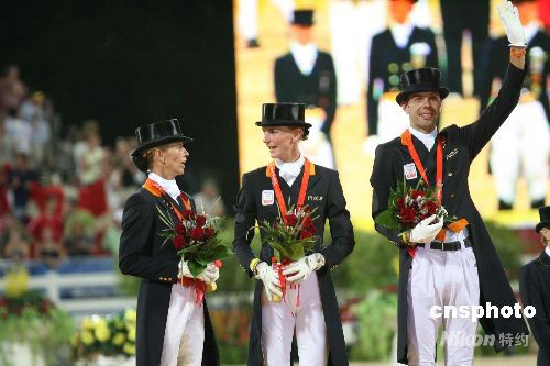 荷蘭隊獲得奧運馬術盛裝舞步團體賽銀牌。中新社發 洪少葵 攝