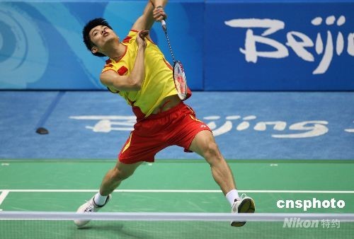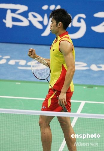 8月15日,中國選手林丹在北京奧運會羽毛球男子單打半決賽中以2比0戰勝隊友陳金,進入決賽。中新社發 武仲林 攝