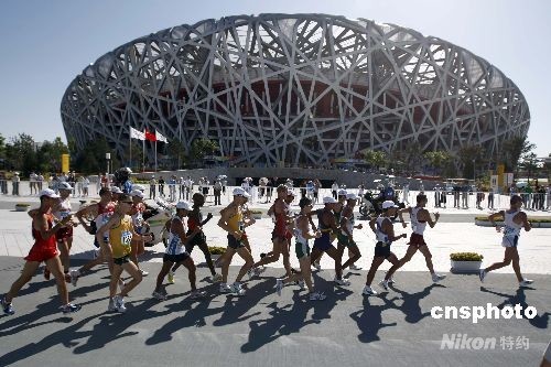 8月16日,北京奧運會田徑比賽第二日,在北京國家體育場進行的男子20公里競走中,俄羅斯選手瓦列里-博爾欽以1時19分01獲得該項目金牌。 銀牌被厄瓜多爾選手赫費爾松·佩雷斯以1小時19分15獲得,銅牌被澳大利亞選手賈里德·塔倫特以1小時19分42秒獲得。 中國三名選手王浩、禇亞飛與董吉敏無緣獎牌。中新社發 盛佳鵬 攝