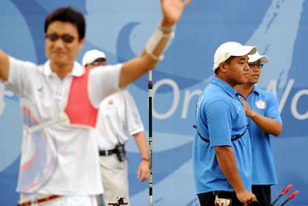 男子射箭個人賽13日持續(xù)進(jìn)行,中華臺北隊射箭選手郭振維(右二)在十六強(qiáng)賽中遭淘汰,以一分之差不敵韓國樸敬模。(上圖)