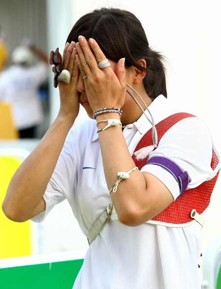 北京奧運女子個人射箭賽12日在北京奧林匹克公園射箭場舉行,中華臺北隊吳蕙如輸給對手未能晉級,心情相當(dāng)難過。(下圖)