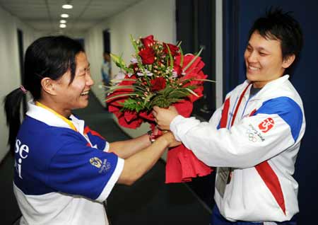 中華臺北代表隊舉重女將盧映锜(右)12日在女子63公斤級,以抓舉104公斤、挺舉127公斤,總合231公斤的成績贏得銅牌,另一面銅牌得主隊友陳葦綾(左)獻上鮮花祝賀。(上圖)