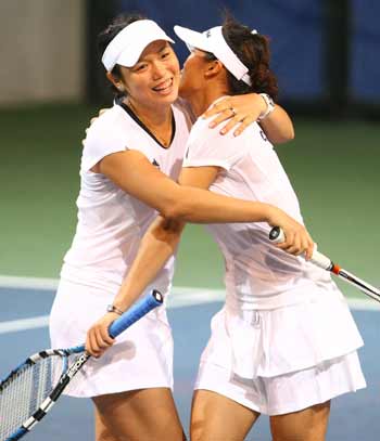 12日晚間進行女子網(wǎng)球雙打第一輪比賽,中華臺北隊詹詠然(左)、莊佳容(右)打到第三盤擊敗法國隊順利晉級,兩人高興的抱在一起。(上圖)