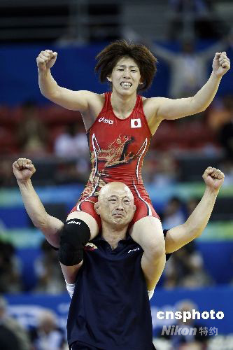 8月16日,北京奧運(yùn)會(huì)摔跤女子自由式55公斤級(jí)的決賽在北京中國農(nóng)業(yè)大學(xué)體育館進(jìn)行,日本選手吉田沙保里戰(zhàn)勝中國選手許莉獲得冠軍。圖為吉田沙保里與教練在賽后“疊羅漢”慶祝奪冠。中新社發(fā) 盛佳鵬 攝
