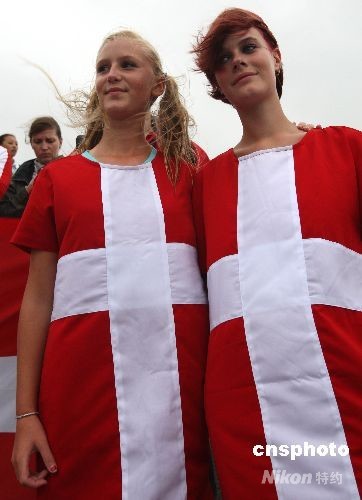 身著國旗圖案服裝的丹麥美女拉拉隊現場格外引人注目。中新社發 趙振清 攝