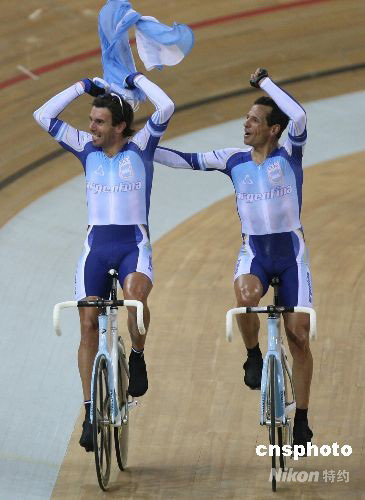 8月19日,阿根廷隊在北京奧運會場地自行車麥迪遜賽上奪得金牌。 中新社發 武仲林 攝