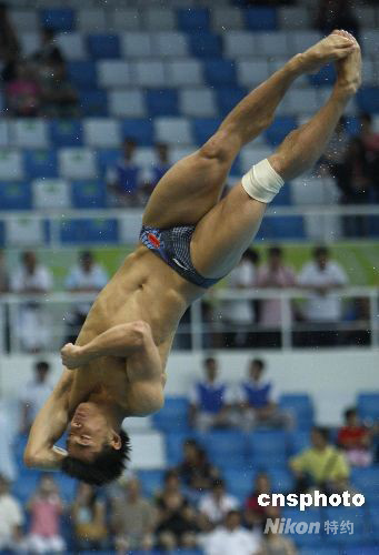 8月19日晚,在國家游泳中心“水立方”進行的北京奧運會男子3米跳板決賽中,中國選手何沖以572.90分奪得金牌,中國代表團金牌總數增至43枚。 中新社發 杜洋 攝