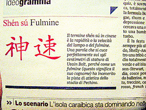 這個“漢字”專欄自北京奧運會開幕之日起,每天一期、每期一詞,每個詞都標注拼音,引出一段新聞。如8月8日的專欄詞匯是“鳥巢”,在這兩個漢字下面用意大利語解釋了“鳥巢”在漢語中的本意,介紹了北京的國家體育場,并配上焰火照耀下的“鳥巢”夜景圖片。其后的專欄相繼刊登了“文身”、“興奮劑”、“球門”、“地區(qū)”、“神速”等漢語詞匯。在漢字“興奮劑”下報道的新聞是:奧組委為實現“干凈的奧運會”已向興奮劑宣戰(zhàn),北京設立了由220名高級專家組成的超級檢測中心,每天檢測數量達250例。“神速”一詞解讀的新聞是:這個在漢語中意為閃電般快速的詞,恰如其分地描繪了飛人博爾特17日晚破百米紀錄的情景。這名身高196cm的運動員,以其閃電般的速度征服了北京國家體育場內的所有觀眾。(記者穆方順)