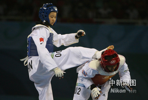 8月20日,中國選手吳靜鈺在北京奧運會跆拳道女子49公斤以下級決賽中戰勝泰國選手布特雷·貝德蓬,奪得冠軍。中新社記者 武仲林 攝