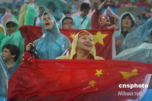 8月21日,中國選手田佳、王潔在奧運(yùn)沙灘排球決賽中以0 :2負(fù)于美國選手克麗·沃爾什、米絲蒂· 梅—特雷納,獲得亞軍。圖為觀眾冒雨為運(yùn)動員助威。中新社發(fā) 武仲林 攝