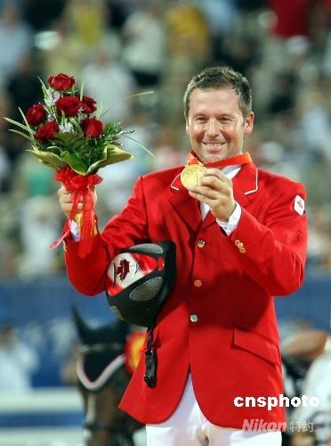 八月二十一日晚,奧運馬術在香港沙田賽場舉行場地障礙個人賽決賽。加拿大選手埃里克·拉馬茲策騎馬匹“希克斯特德”贏得金牌。中新社發 鄧慶樂 攝