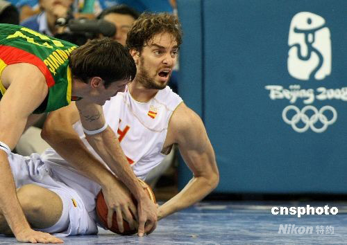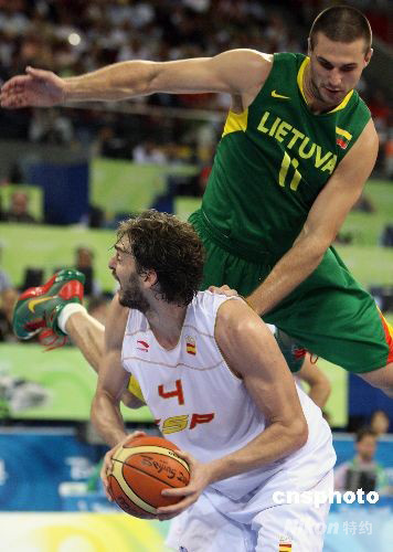 北京奧運會男子籃球半決賽首場比賽8月22日晚在五棵松籃球館開戰,2006年世錦賽冠軍西班牙隊以91比86艱難戰勝極為強悍的立陶宛隊,率先進入決賽。NBA球星4號保羅·加索爾砍下全場最高的19分。 中新社發 任晨鳴 攝