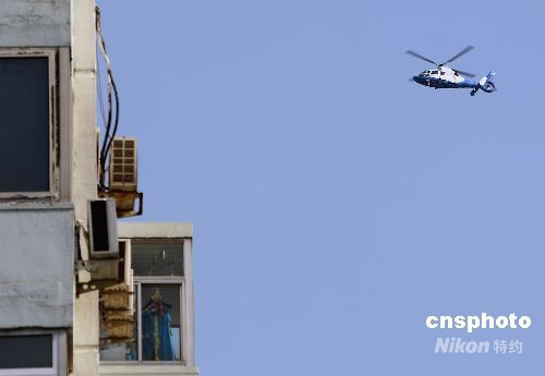8月24日上午,直升機在北京中關村上空盤旋,實時直播男子馬拉松賽事。當天7時30分,北京奧運會田徑比賽傳統壓軸大戲——男子馬拉松比賽正式開跑,賽程42.195公里,終點為國家體育場“鳥巢”。中新社發 劉新 攝