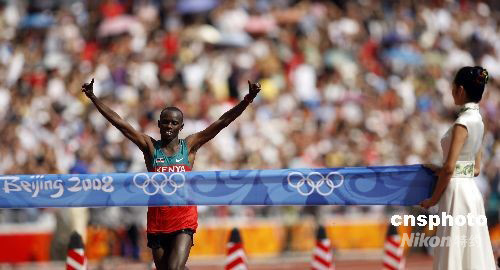 8月24日,北京奧運會田徑比賽的最后一天,在男子馬拉松的比賽中,肯尼亞選手塞繆爾-卡馬烏以2小時06分32秒奪冠,并且打破了奧運會紀錄。銀牌被摩洛哥選手賈瓦德-加里卜以2小時07分16秒奪得,同樣打破了奧運會紀錄,第三名被埃塞俄比亞的策加耶-凱貝德-沃爾多法以2小時10分00秒獲得。中國選手鄧海洋和李柱宏以2小時16分17秒和2小時24分08秒分列第25位和51位。中新社發 盛佳鵬 攝
