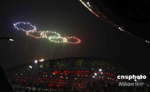 8月24日晚,第二十九屆夏季奧林匹克運動會在北京閉幕。閉幕式上燃放的彩色“五環”焰火獨特新穎。 中新社發 盛佳鵬 攝