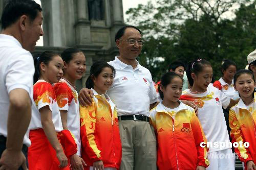 九月一日上午,北京奧運內(nèi)地金牌運動員代表團在澳門展開第二日訪問行程,代表團團長劉鵬與奧運女子體操團體金牌選手們在澳門著名景點大三巴前留影。中新社發(fā) 洪少葵 攝
