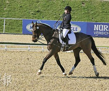 失去雙臂的德國女騎手Bettina Eistel,在上屆殘奧馬術賽中以口控制韁繩,奪得一銀一銅佳績。(圖片來源:明報)