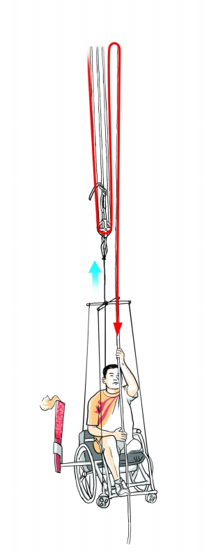 9月6日晚,北京2008殘奧會開幕式在國家體育場“鳥巢”舉行。圖為殘奧會田徑金牌獲得者、最后一棒火炬手侯斌坐在輪椅上,拉繩子攀升的方式去點燃“鳥巢”上方的主火炬。 中新社發 杜洋 攝