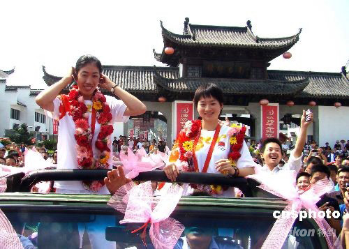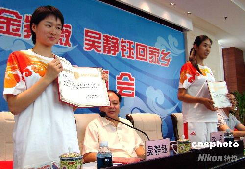9月8日,江西省景德鎮市熱烈歡迎北京奧運會冠軍金紫薇、吳靜鈺載譽回鄉,景德鎮市婦聯和團委分別授予兩人“三八紅旗手標兵”稱號和“五四青年獎章”。在此次北京奧運會上,金紫薇和吳靜鈺分別奪得賽艇女子4人雙槳項目和跆拳道女子49公斤級比賽冠軍。 中新社發 程萬海 攝