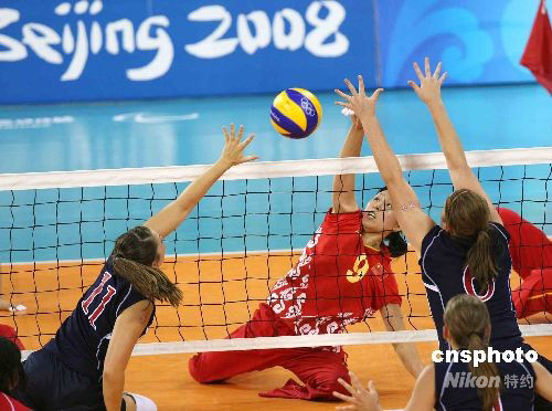 北京殘奧會坐式排球9月9日晚繼續在北京的中國農業大學體育館舉行,雅典殘奧會冠軍中國女隊以3比0完勝美國隊。中新社發 任晨鳴 攝