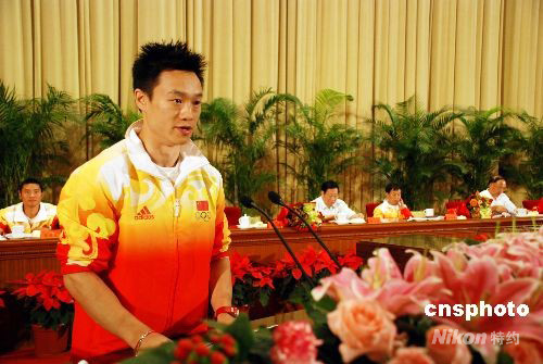 第29屆奧運會男子體操團體冠軍、個人全能冠軍楊威在報告會上發言。中新社發 楊慧峰 攝